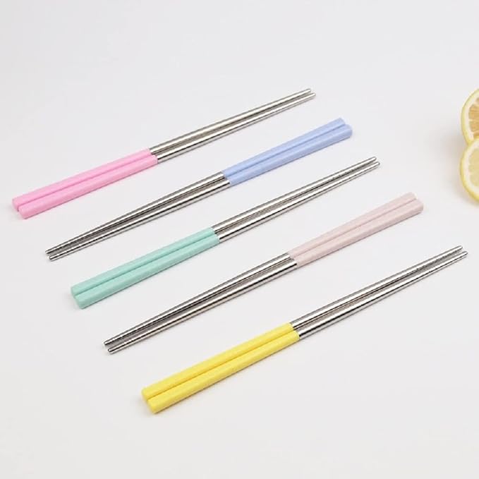 Stainless Steel Lightweight Reusable Chopsticks – Non-Slip Dishwasher Safe Wheat Set of 10 Assorted Colors in Barrel