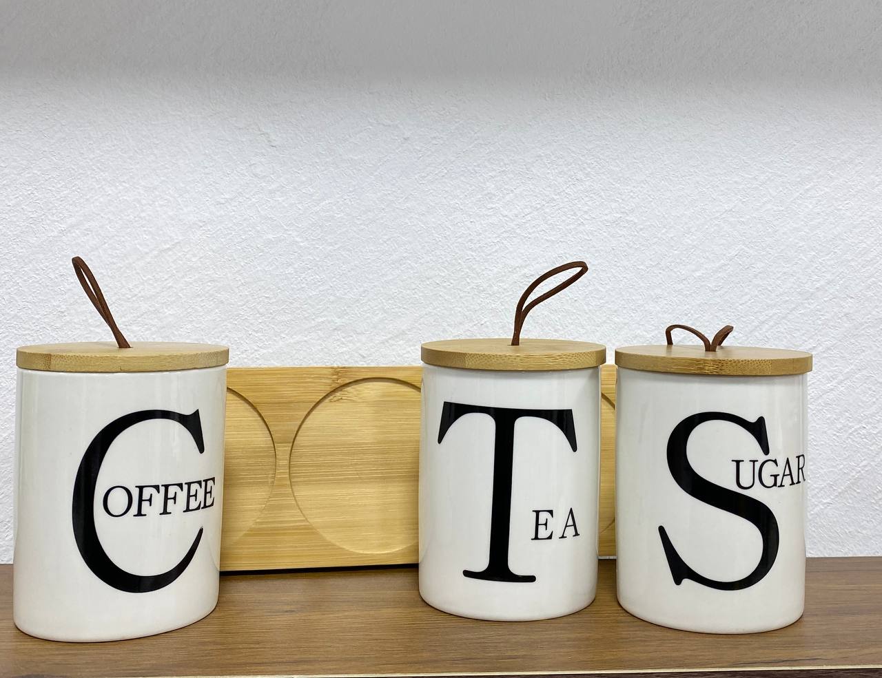 Ceramic Tea Coffee Sugar Storage Container Set of 3 with Stand and Bamboo Wood Lid – Modern Spice Jars Large Capacity for Kitchen Organization and Decor