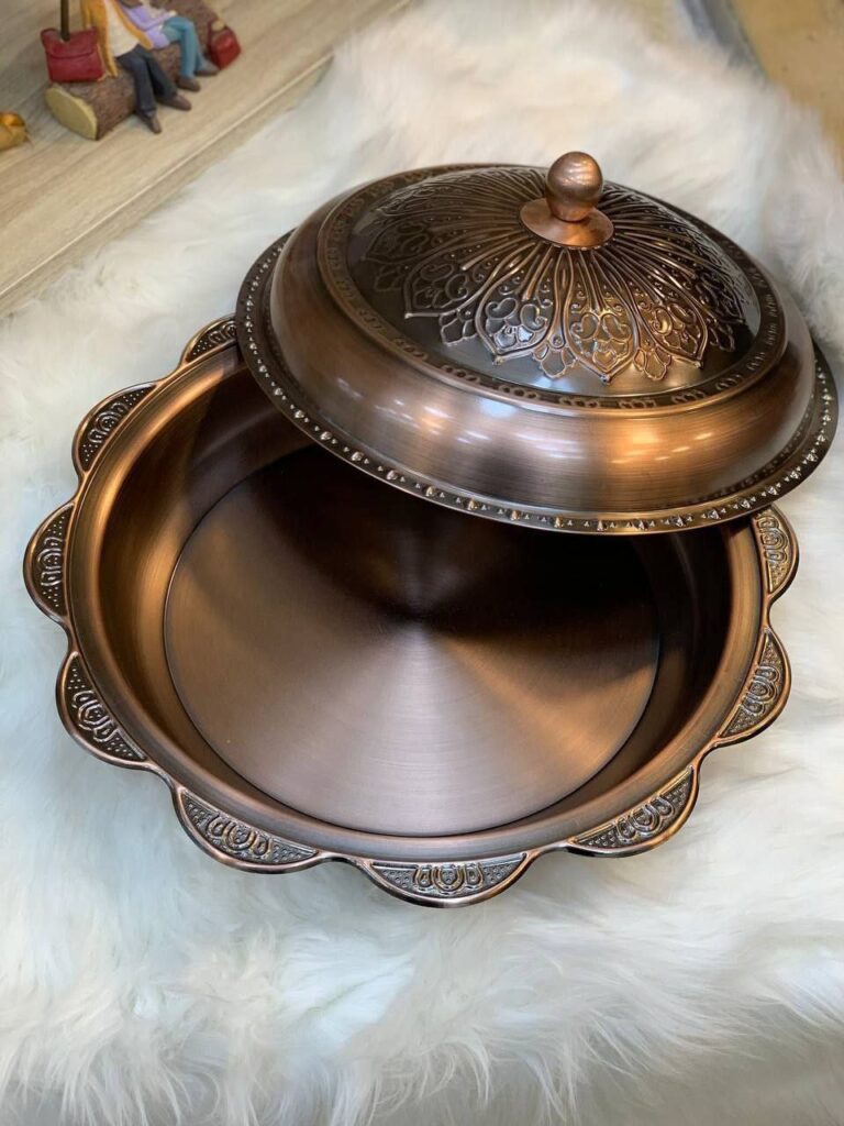 Copper Kabsa Tray with Lid – A large copper kabsa tray with a diameter of 42 cm, perfect for gatherings and hospitality. Made of strong, durable, and heat-resistant copper.