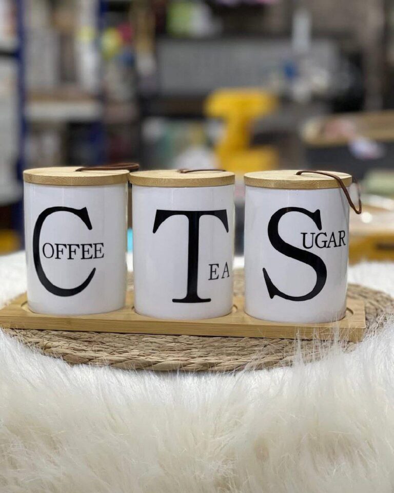 Ceramic Tea Coffee Sugar Storage Container Set of 3 with Stand and Bamboo Wood Lid – Modern Spice Jars Large Capacity for Kitchen Organization and Decor