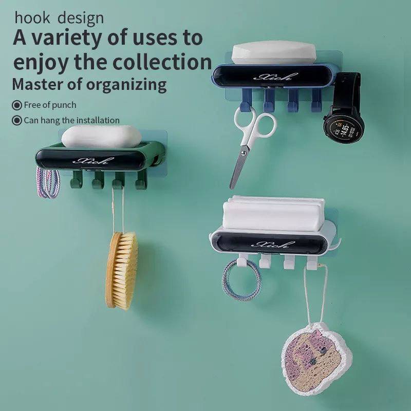 Double Soap Holder with 6Pcs Hook and Towel Bar, Wall Mounted Soap Dish, Self Draining Adhesive Bar Soap Holder for Shower Bathroom Bathtub Kitchen, Waterproof, No Drilling, Space Saving