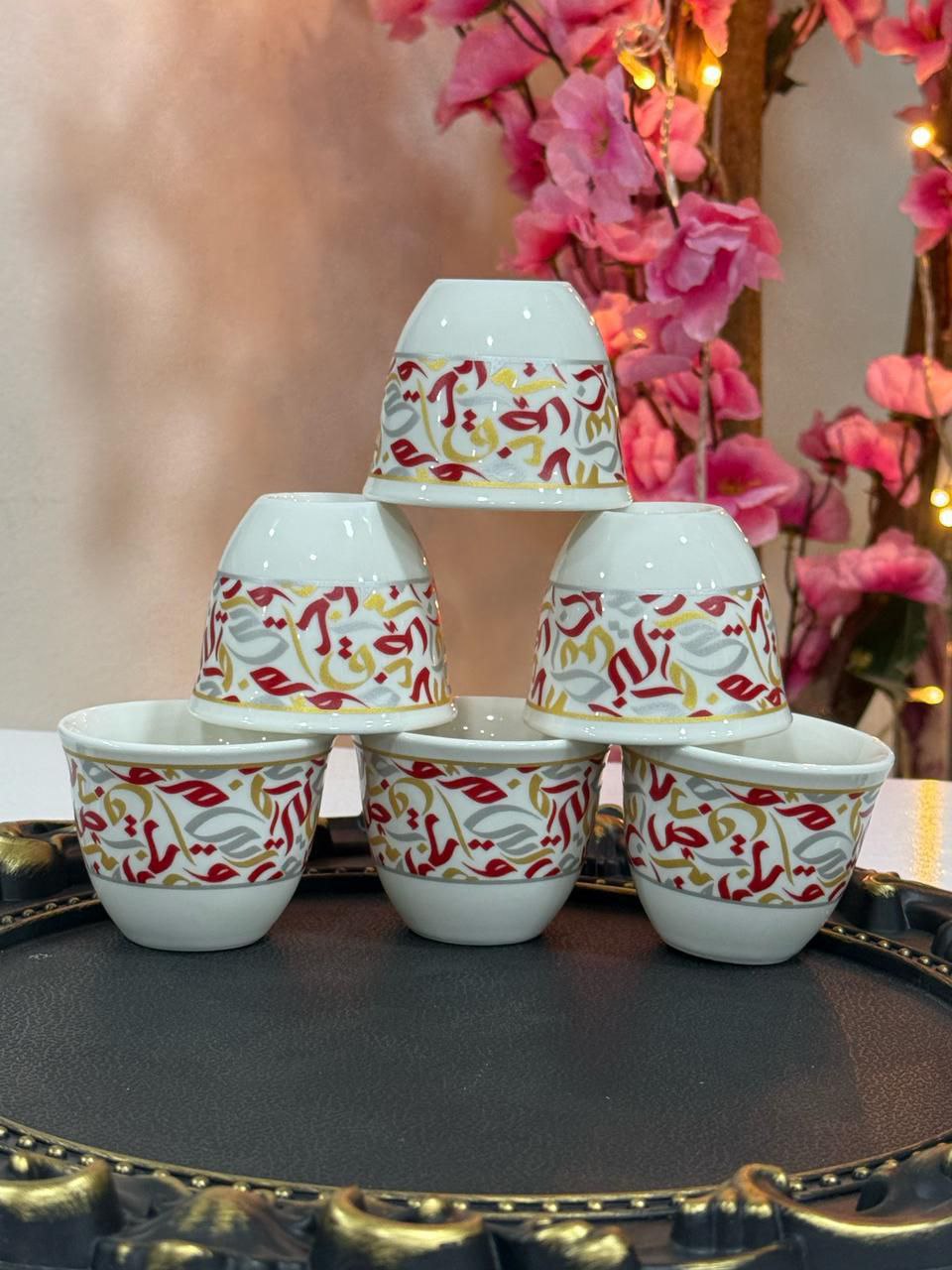 - ELEGANT DESIGN: Set of 6 porcelain coffee cups featuring beautiful Arabic calligraphy in black and gold against a pristine white background, perfect for traditional Arabic coffee service