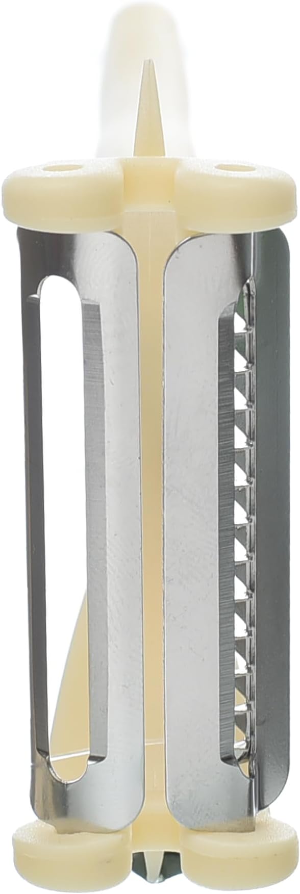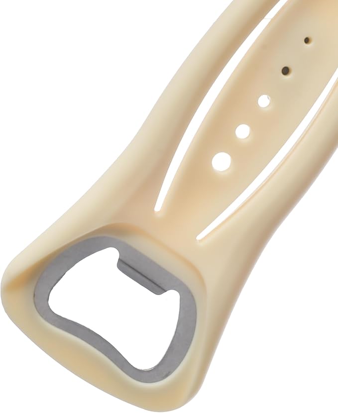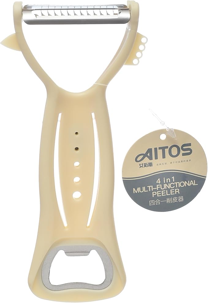 - Ergonomic beige plastic handle provides a comfortable grip for precise peeling and bottle opening tasks.